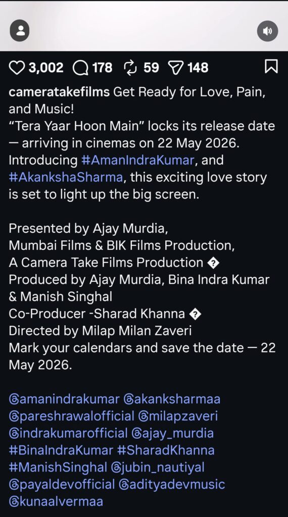 With Indra Kumar’s guidance and Milap’s magic, this could be a sleeper hit. Mark your calendars – Tera Yaar Hoon Main looks set to steal hearts!