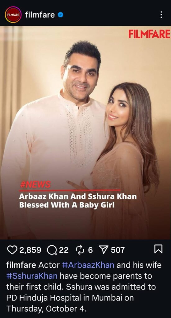 Bollywood actor and producer Arbaaz Khan has welcomed a baby girl with his wife Sshura Khan. The couple shared the joyful news with their fans and well-wishers recently.