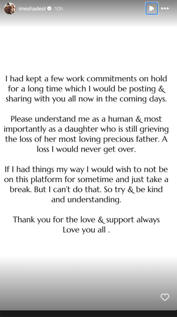Esha shared an emotional message on social media, opening up about her struggle to balance professional commitments with personal loss. “As a daughter still grieving,” she wrote, expressing the difficulty of continuing with daily life while processing her father’s death.