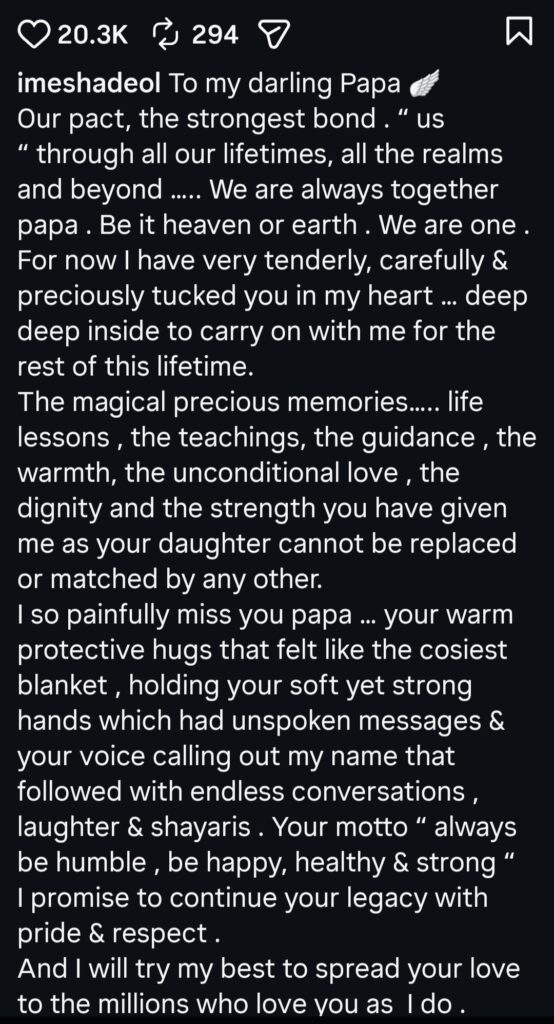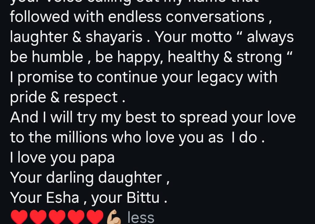 Esha posted heartfelt words on social media, expressing that she “painfully misses” her dad. She wrote that she has “tucked him in her heart,” showing the deep bond they share. The message reflected the special relationship between father and daughter.