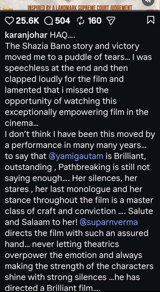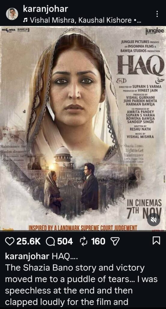 This comes hot on the heels of Alia Bhatt’s shoutout, where she called Haq “unmissable.” Fans are thrilled as big names rally behind the movie, boosting its OTT run. Released amid mixed box office results, Haq now gains traction through word-of-mouth from stars like Karan and Alia.