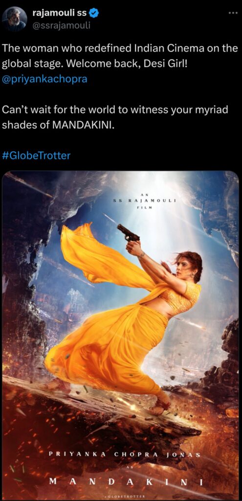 Bollywood and Hollywood star Priyanka Chopra has unveiled her first look from the highly anticipated film “Globetrotter.” The actress will be seen playing the character Mandakini alongside Telugu superstar Mahesh Babu in this exciting new project.