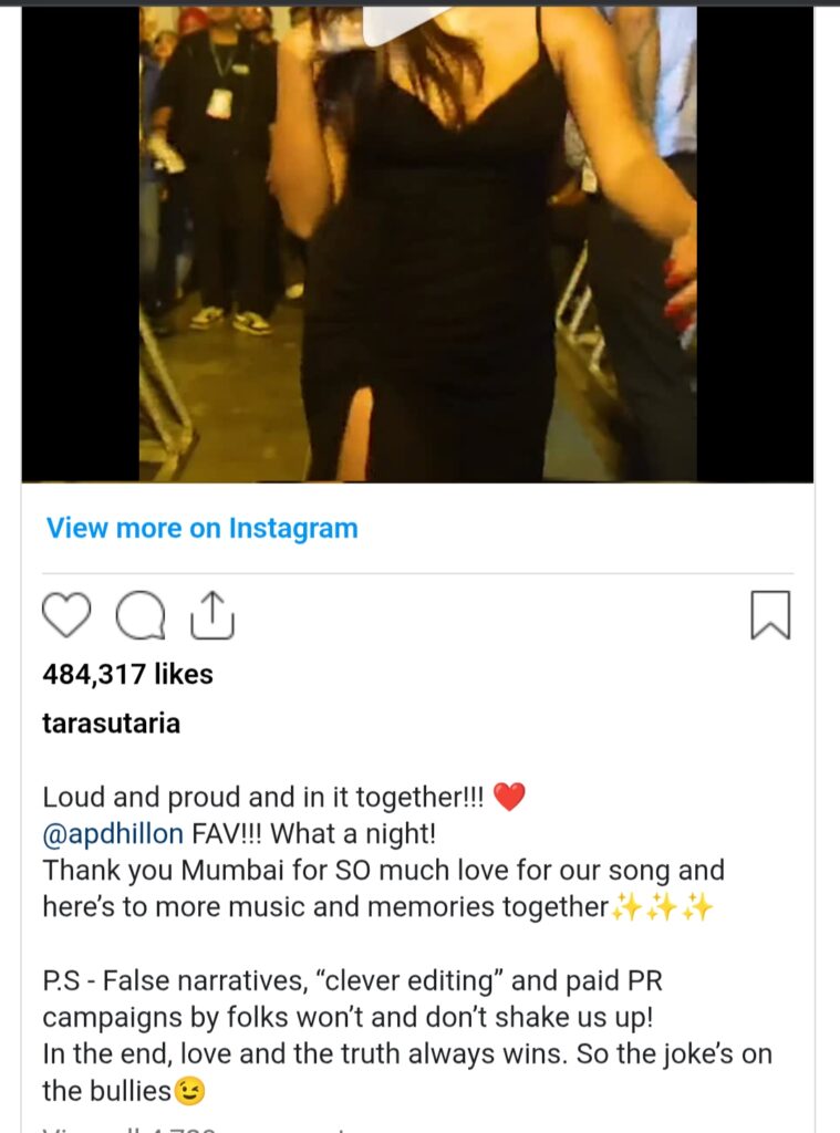 Bollywood actress Tara Sutaria recently addressed online criticism after videos from singer AP Dhillon’s concert went viral on social