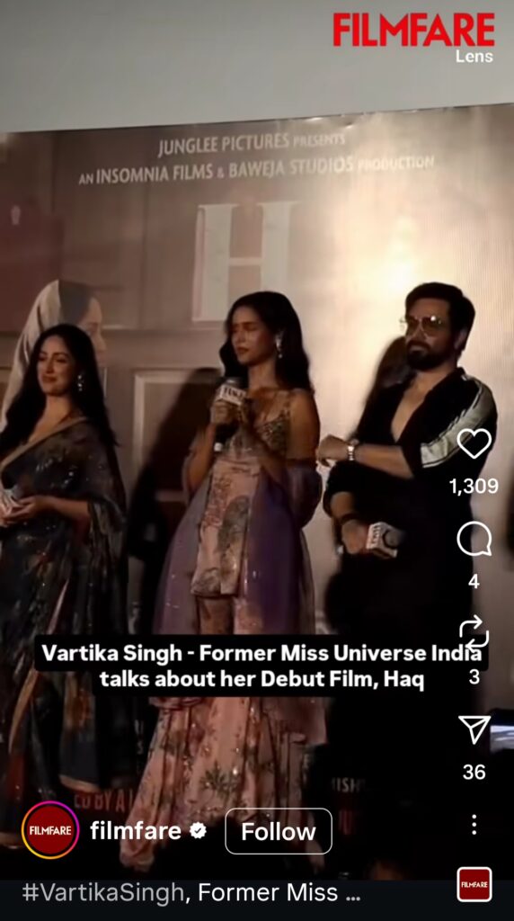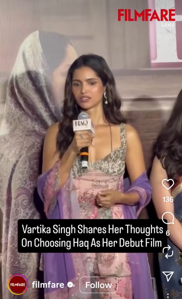 Haq, directed by Suparn Varma and backed by prominent production houses, is inspired by the landmark Supreme Court case Mohd. Ahmed Khan vs. Shah Bano Begum. The film explores themes of faith, justice and women’s rights. In it, Emraan plays a determined lawyer, Yami takes on a strong emotional role, and Vartika steps into a challenging part that combines vulnerability and strength.
